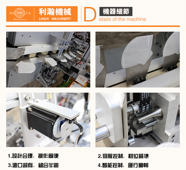 “鴻達牌”折疊口罩耳掛式耳帶機,是使用先進的程序控制完結主動化出產,從口罩本體 進入到完結耳帶焊接均為主動化作業;設備經過伺服送料,特制定位體系與主動耳帶旋轉設備進行完美的合作,高質高效的出產出各款折疊口罩