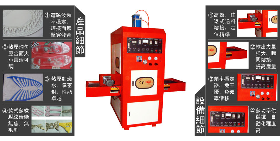 6、自動滑臺式高周波熔斷機振蕩頻率符合國際工業波段標準,由高Q值真空電子管自激振蕩器產生高頻電磁場,使加工塑膠在上下電極間的高頻電場內,使其分子產生劇烈運動摩擦,在模具的壓力下得到其熔接效果。高周波熔斷機采用H型龍門結構,左右雙向自動滑臺,往返連續推送模具,運行高效。